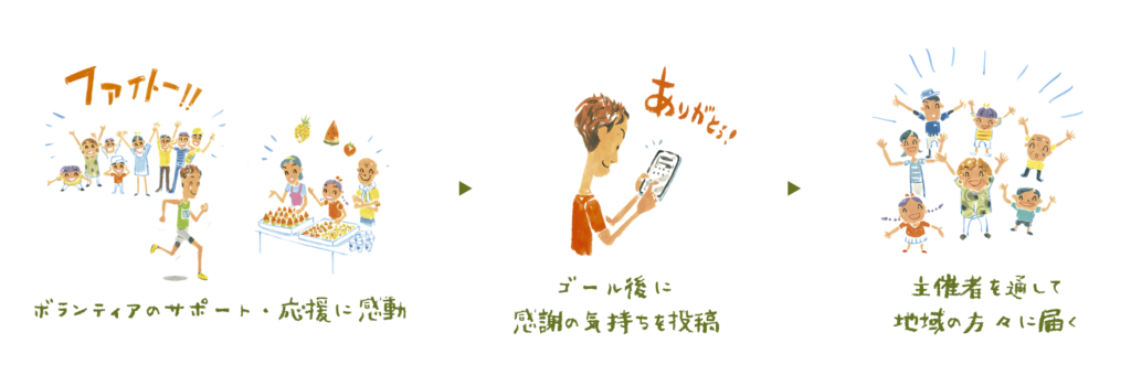 ボランティアスタッフや沿道で応援してくださった方々に対して「ありがとうメッセージ」を募集します ホームお知らせボランティアスタッフや沿道で応援してくださった方々に対して「ありがとうメッセージ」を募集します この度はご参加をいただきありがとうございました。 本大会はボランティアスタッフや地域の皆さまの協力、沿道で応援してくださる皆さまによって支えられています。 大会を支え、参加者の皆さまをサポートしてくださったボランティアスタッフや沿道で応援してくださった方々に対して「ありがとうメッセージ」を募集します。 メッセージは下記から所定の方法でご登録ください。 ボランティアスタッフへ「ありがとうメッセージ」はこちら